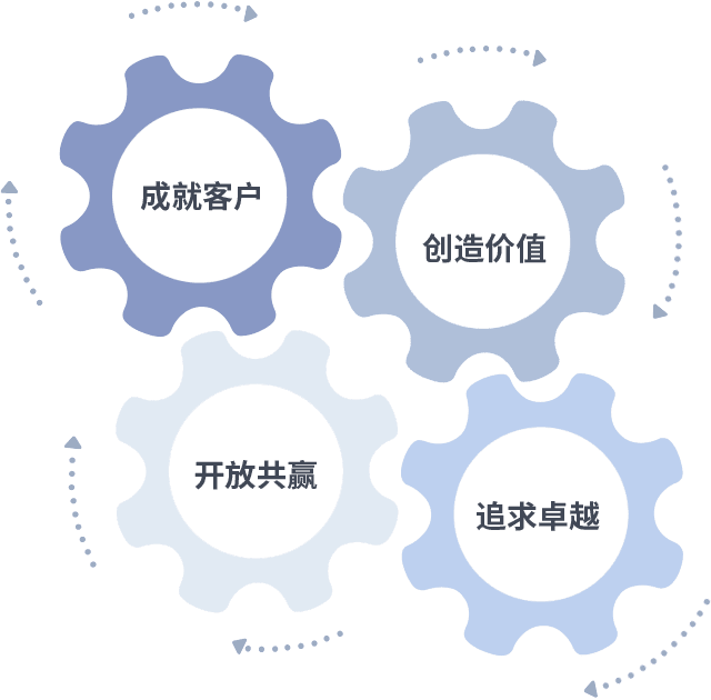 成就客户是一切决策的出发点,,,创造价值是衡量所有工作的标准,,追求卓越是我们做事做人的态度,,开放共赢是我们的格局也是最终的结果。。。价值观的齿轮环环相扣,,,,推动着组织里的每个人不断向前。。